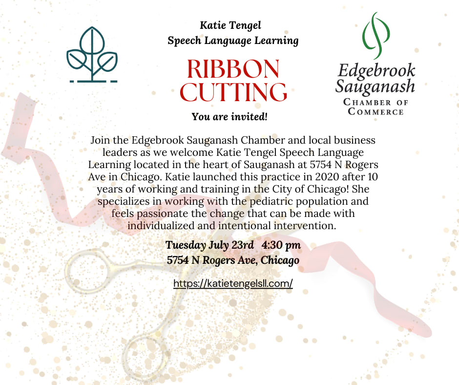 Join the Edgebrook Sauganash Chamber and local business leaders as we welcome Katie Tengel Speech Language Learning located in the heart of Sauganash at 5754 N Rogers Ave in Chicago. Katie launched this practice in 2020 after 10 years of working and training in the City of Chicago! She specializes in working with the pediatric population and feels passionate the change that can be made with individualized and intentional intervention. https://katietengelsll.com/Images